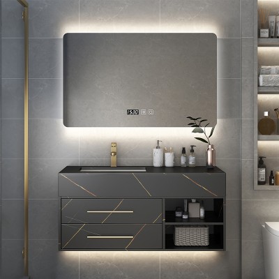 岩板浴室柜轻奢挂墙式智能镜洗手台洗脸盆柜组合洗漱台黑色加宽柜