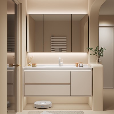 奶油风浴室柜卫生间洗漱台洗脸盆柜组合挂墙式陶瓷一体盆洗手台柜