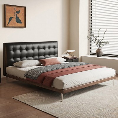 真皮复古悬浮床极简2米大床主卧黑色华夫格床现代简约齐边实木床